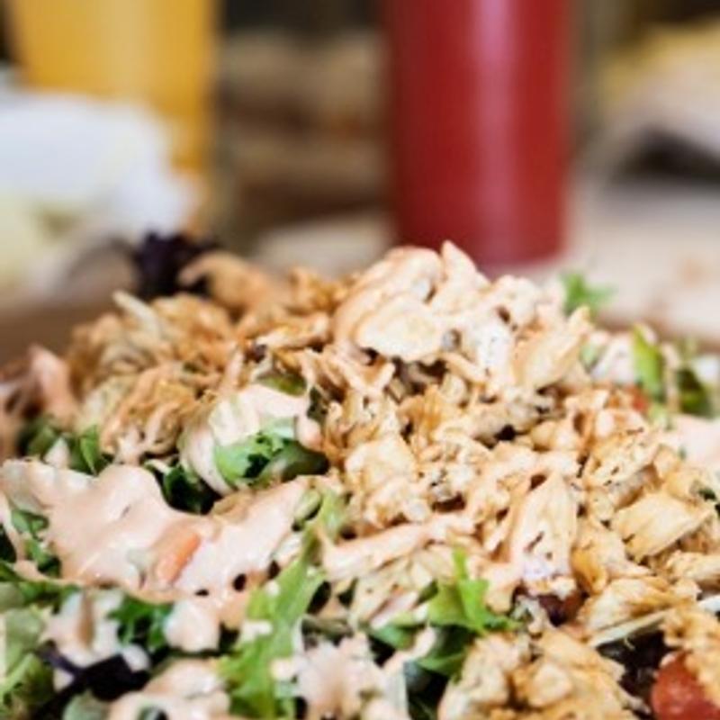 Our signature fried chicken is diced and served over a bed of spring mixed greens, diced tomato, potato crunch, and our sweet and savory house sauce. Grilled Chicken option (Gluten Free option).