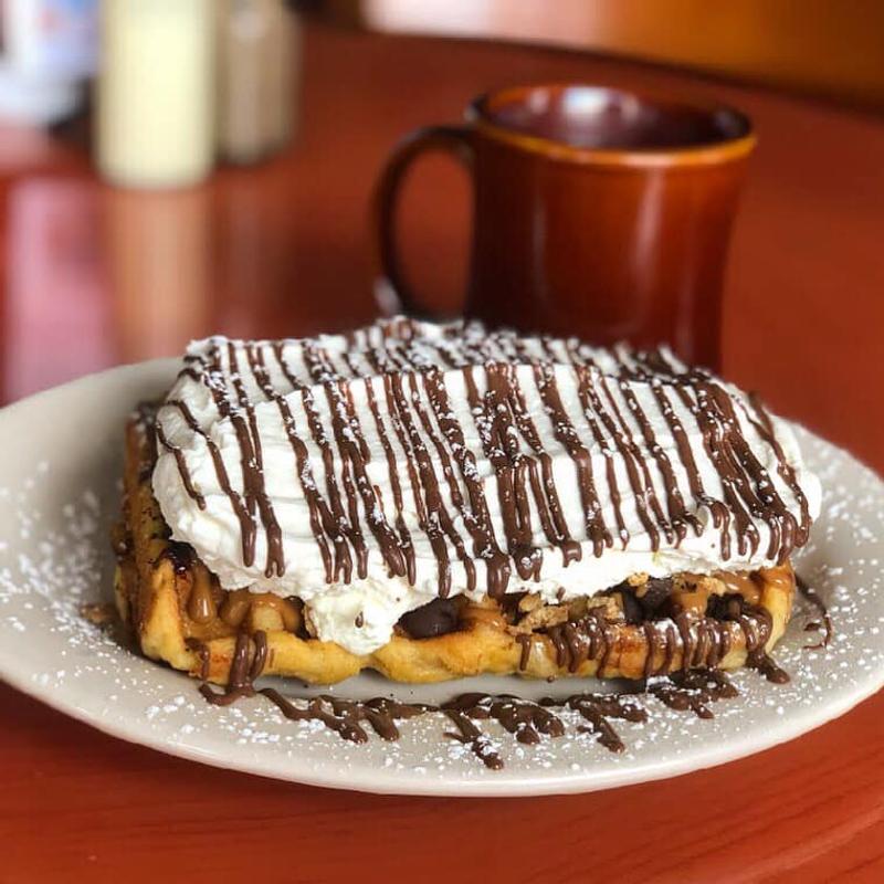 Our Recommendation! Includes white American cheese, grilled onions, roasted sweet peppers, and tomatoes served on our homemade bread. Upgrade to make the waffle the bread +$3.64