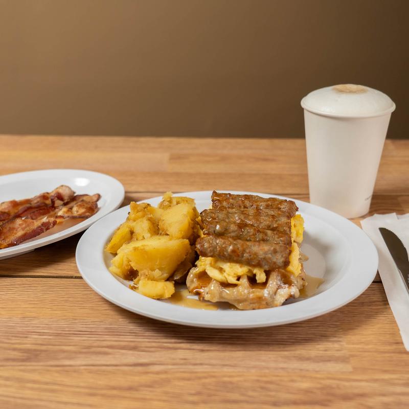 Regular $10.50 | Kids Mini Waffle $8.99 • Liege waffle topped with chopped bacon or chopped sausage, drizzled with real maple syrup, served with a side of home fries. Add: 2 Eggs Any Style +$3.22